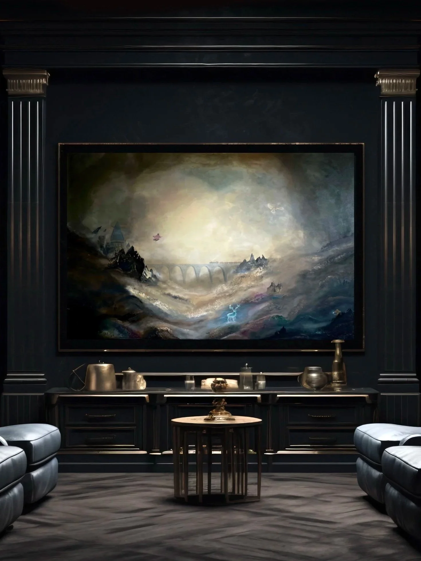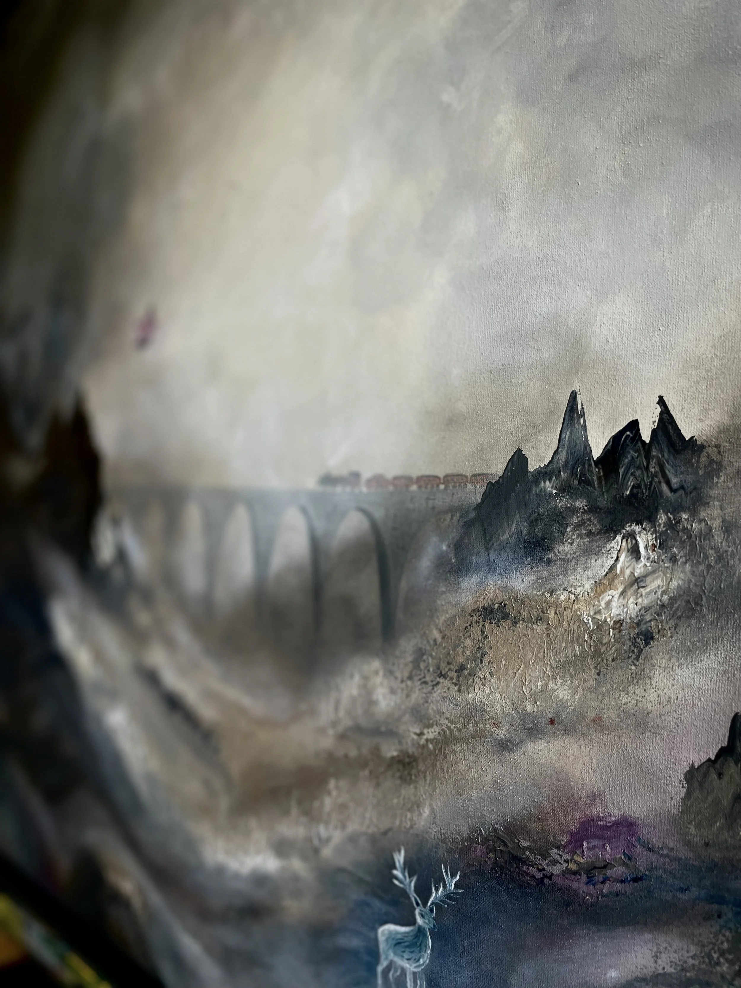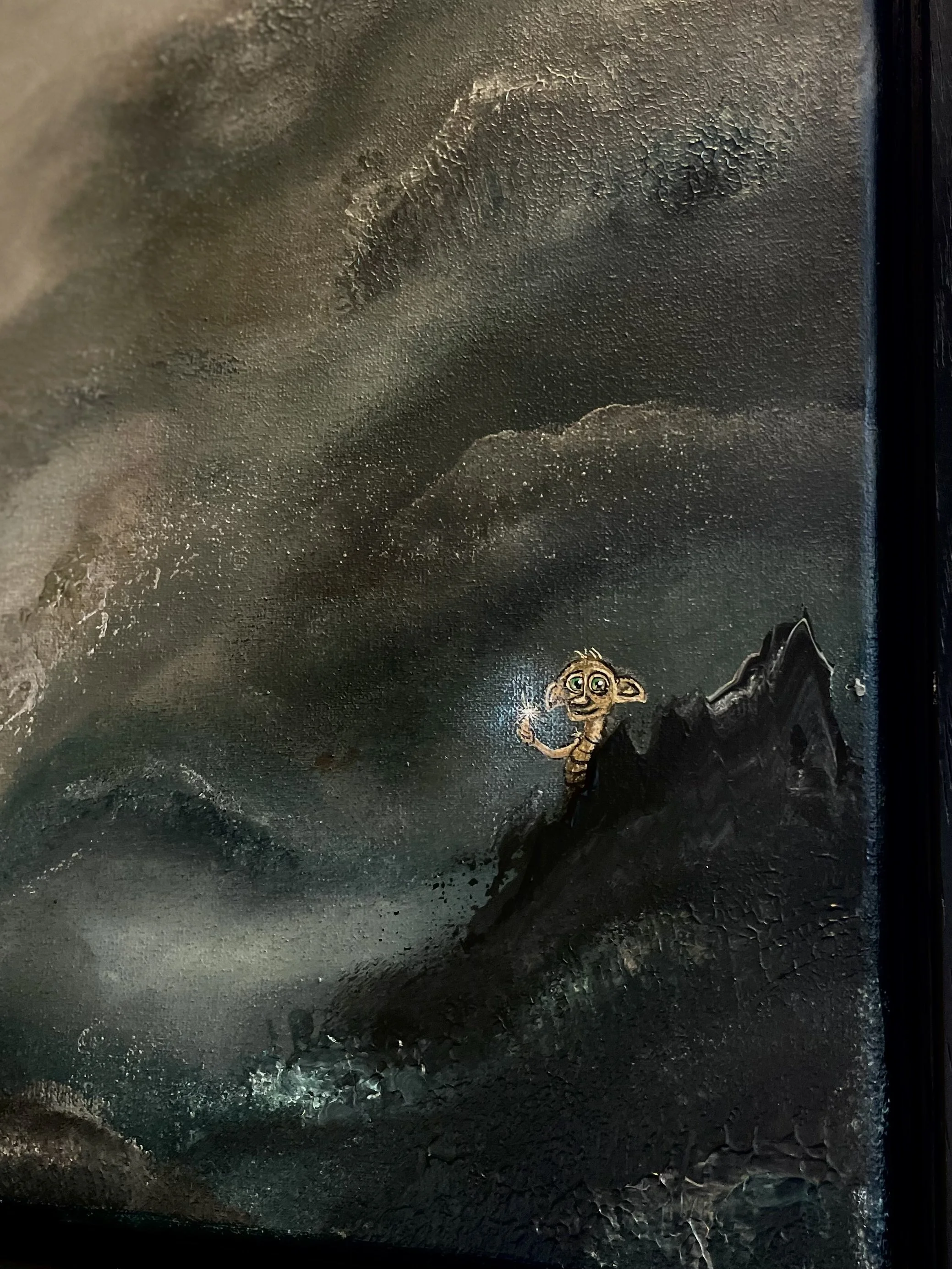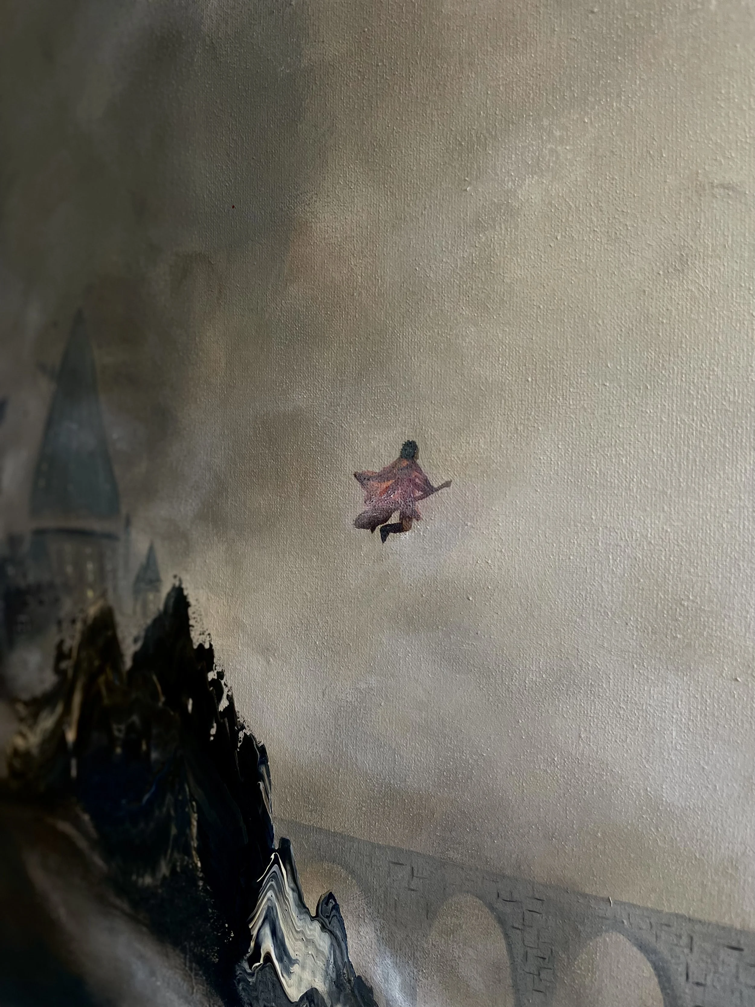 At first glance, it looks like a misty, desolate landscape wrapped in darkness. But as you look closer, hidden details emerge: Harry flying on his broomstick, Dementors hovering above the towers of Hogwarts, Hedwig cutting through the fog and the iconic train crossing the viaduct in the distance. Among the shadows, a luminous Patronus stag stands as a symbol of hope, while Dobby reveals himself with his glowing finger; a tiny spark of light in the gloom.