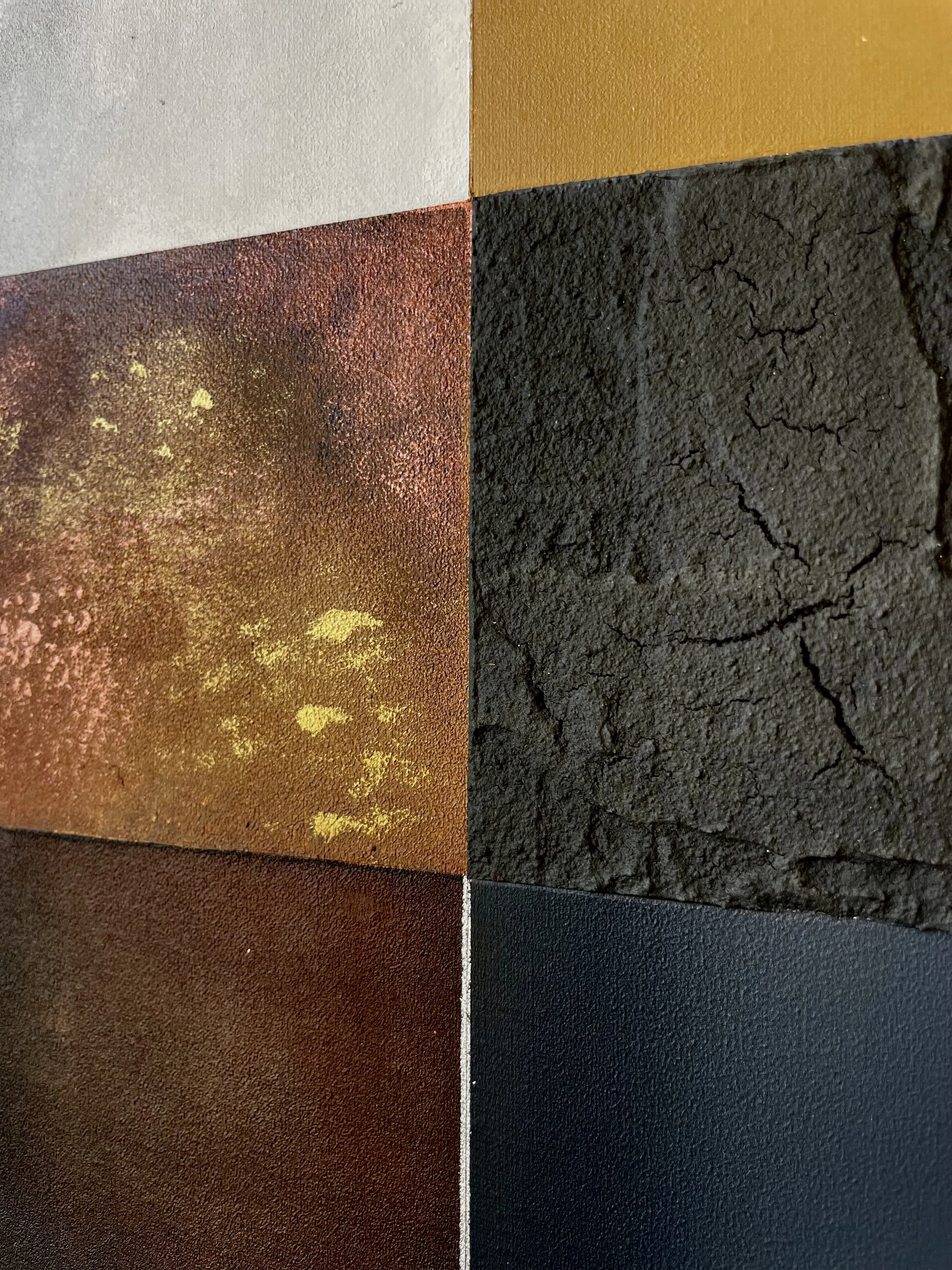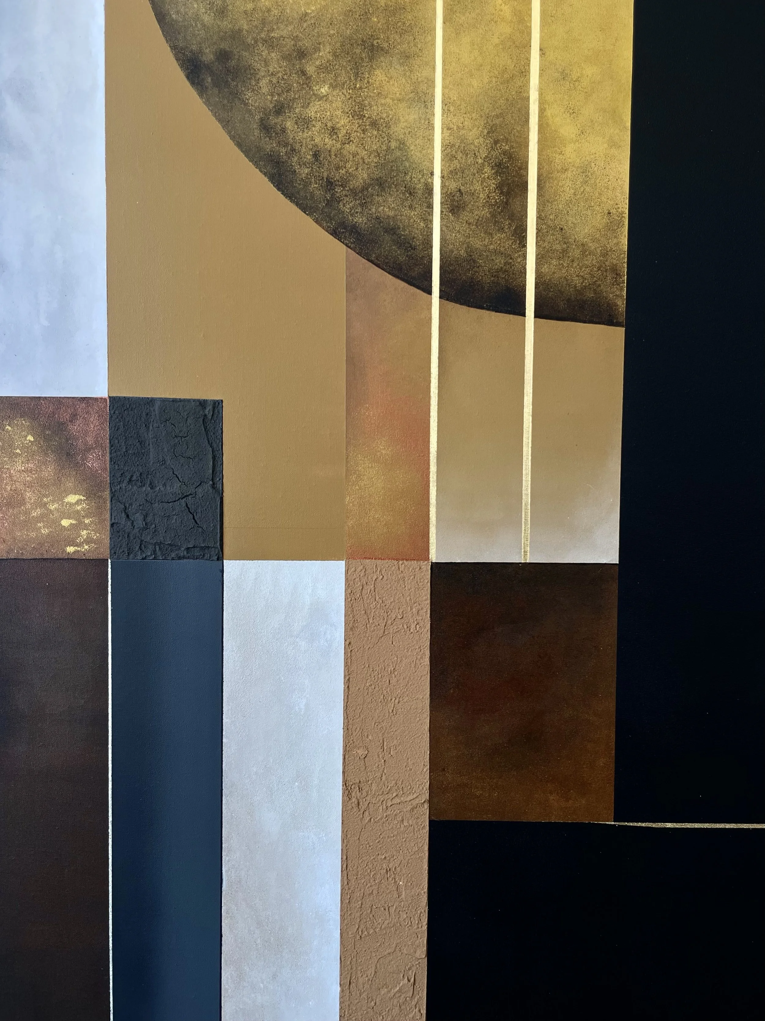 The use of gold and silver leaf, black, white and earthy tones was a conscious choice, in line with the materials and colors used in the interior. The metal leaf brings light and reflection into the surface, changing subtly with the viewer’s position.