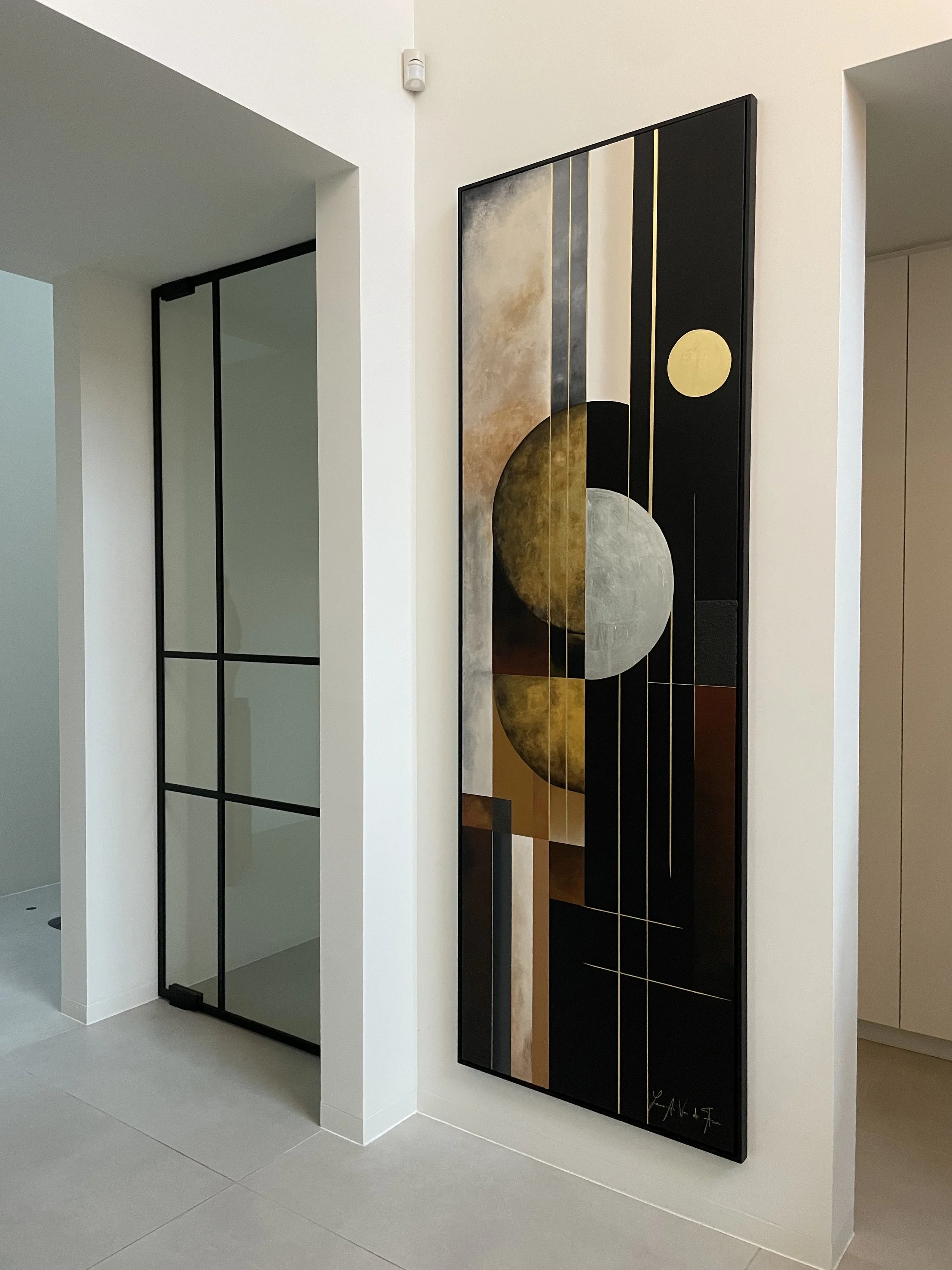 This large-scale painting was created specifically for the entrance hall; a space with clear architectural lines and a ceiling height of nearly six meters. The work is connected to its surroundings: the vertical shapes relate to the steel-framed doors, while the circular forms are based on the round chandeliers in the space.